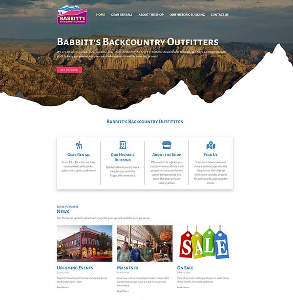 Babbitt’s Backcountry Outfitters asked for a site that offered less info but more useful info, focusing on rentals and the shop. We produced a design that emphasizes local outdoors, nearby destinations, the unique store location and the historic building. Visuals include craggy peaks, topo map backgrounds, icons, photos, and an Instagram feed.