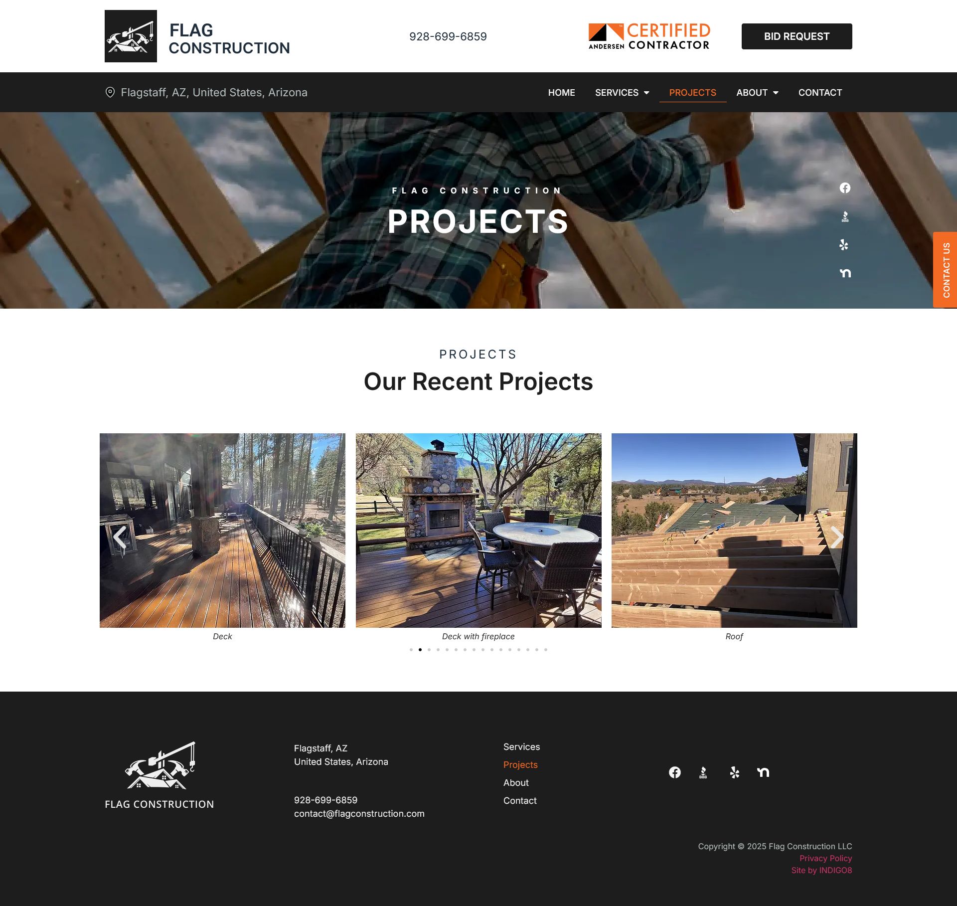 Brian asked for a new website to replace an existing Wix site. The new Flag Construction website would include 11 pages, a dynamic project portfolio, and multiple email submission forms. This WordPress site includes basic search engine optimization, Google Analytics setup, and custom icons for browsers and mobile devices.
